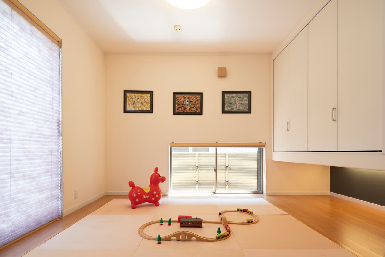 和室(タタミ室)をリビングに隣接させ配置、ここを子供のメインの遊び場とします。