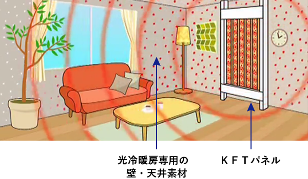 パネルの冷暖効果を、壁・天井の内装材に含まれているセラミックが広げてくれるイメージとなります。離れた部屋にも効率的に冷暖効果が及びます。