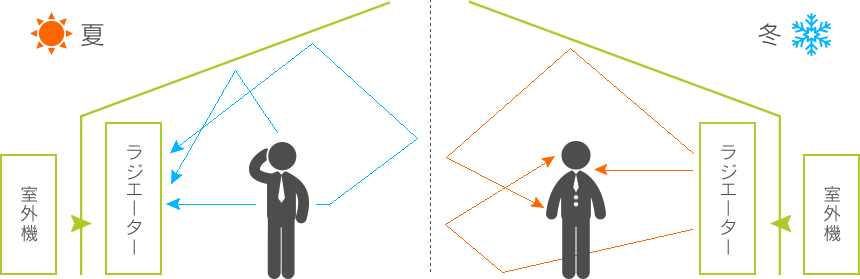 送風がないため、冷風で体の一部が冷えたり、温風で顔がほてる等、風が直接当たる不快感から解放されます。また、運転音がなく静かなので、静粛な室内空間を作り出すことができます。