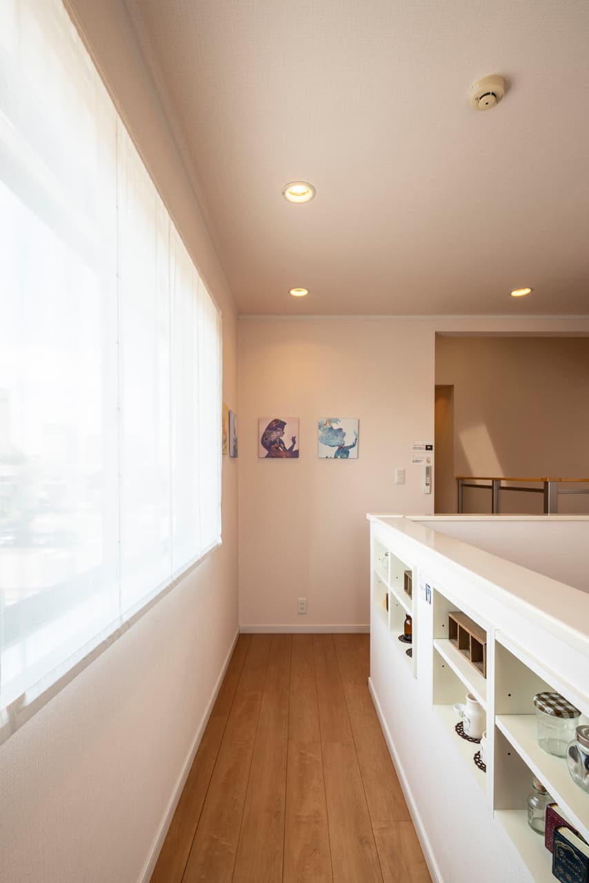 ニッチ収納から好きな本を持ってきて読んだり、おもちゃで一緒に遊んだり、工作を手伝ったり、作ったものを飾ったりと、家族のコミュニケーションスペースとして多彩な機能を持ちます。